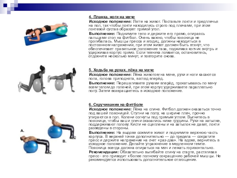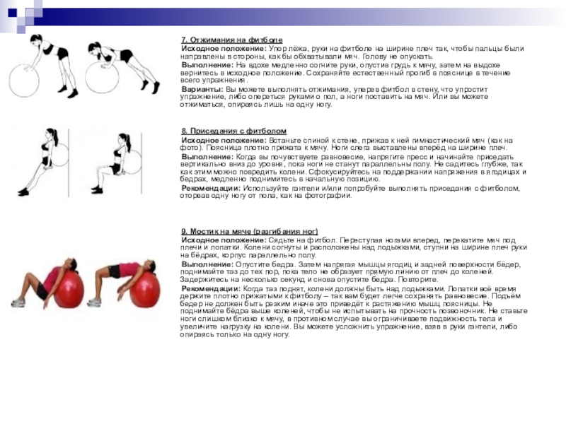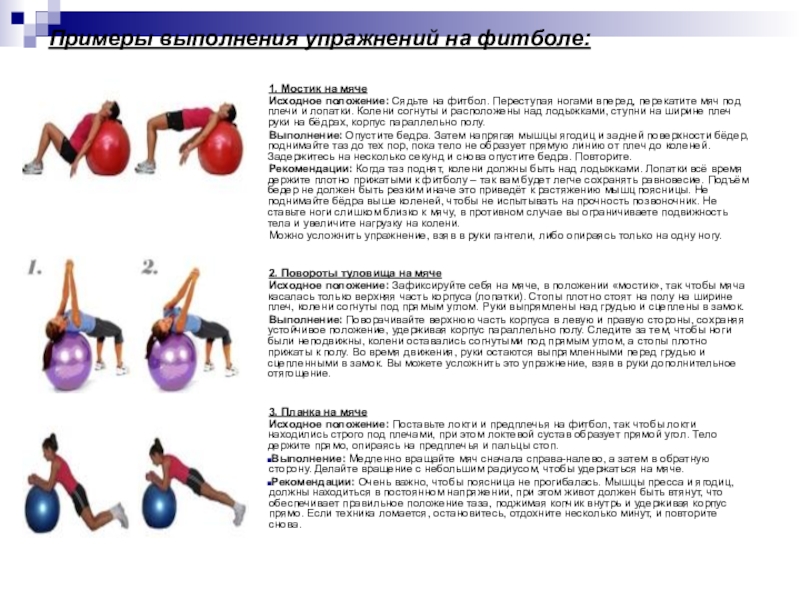 Слайд 6Примеры выполнения упражнений на фитболе: