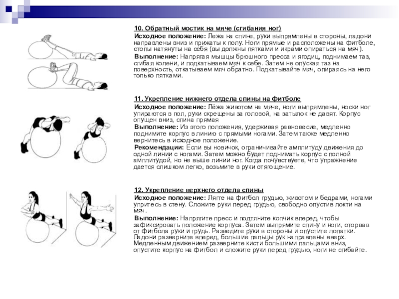 - научить выполнять упражнения в разных исходных положениях: сидя на мяче, лежа на спине на мяче, лежа на груди на мяче, лежа на полу, ноги на мяче и др.,