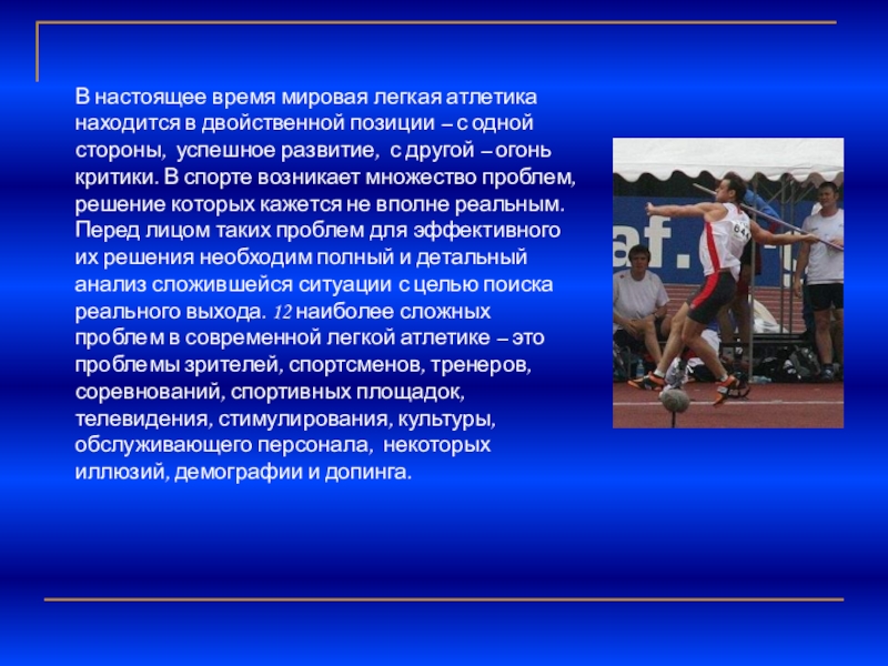 с одной стороны, успешное развитие, с другой – огонь критики. В спорте возникает множество проблем, решение которых кажется не вполне реальным. Перед лицом таких проблем для эффективного их решения необходим полный и детальный анализ сложившейся ситуации с целью поиска реального выхода. 12 наиболее сложных проблем в современной легкой атлетике – это проблемы зрителей, спортсменов, тренеров, соревнований, спортивных площадок, телевидения, стимулирования, культуры, обслуживающего персонала, некоторых иллюзий, демографии и допинга.