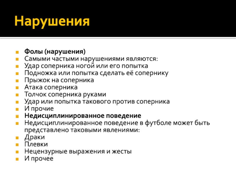 Недисциплинированное поведение в футболе может быть представлено таковыми явлениями: