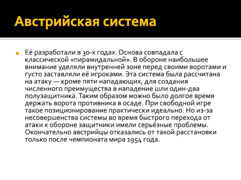 «пирамидальной». В обороне наибольшее внимание уделяли внутренней зоне перед своими воротами и густо заставляли её игроками. Эта система была рассчитана на атаку — кроме пяти нападающих, для создания численного преимущества в нападение шли один-два полузащитника. Таким образом можно было долгое время держать ворота противника в осаде. При свободной игре такое позиционирование практически идеально. Но из-за несовершенства системы во время быстрого перехода от атаки к обороне защитники имели серьёзные проблемы. Окончательно австрийцы отказались от такой расстановки только после чемпионата мира 1954 года.