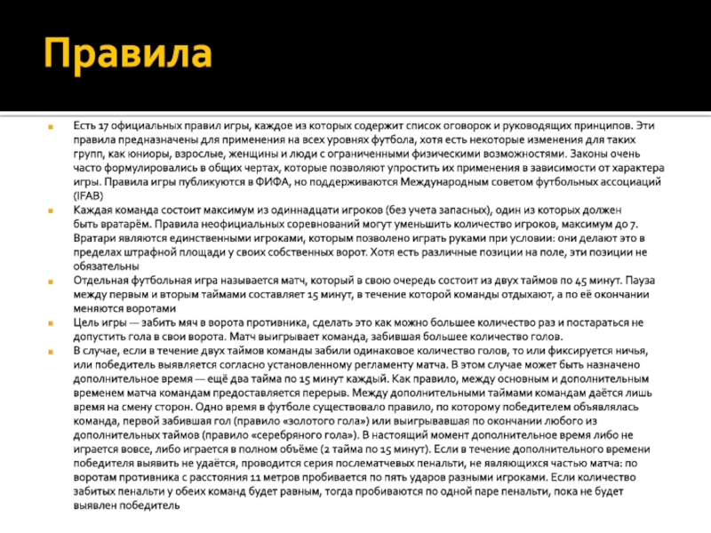 оговорок и руководящих принципов. Эти правила предназначены для применения на всех уровнях футбола, хотя есть некоторые изменения для таких групп, как юниоры, взрослые, женщины и люди с ограниченными физическими возможностями. Законы очень часто формулировались в общих чертах, которые позволяют упростить их применения в зависимости от характера игры. Правила игры публикуются в ФИФА, но поддерживаются Международным советом футбольных ассоциаций (IFAB)