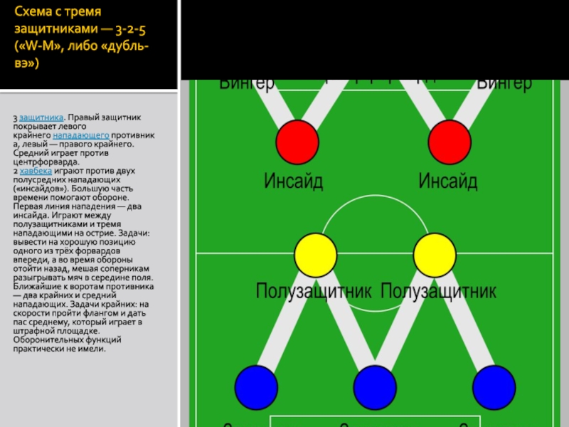 Слайд 6Схема с тремя защитниками — 3-2-5 («W-M», либо «дубль-вэ»)