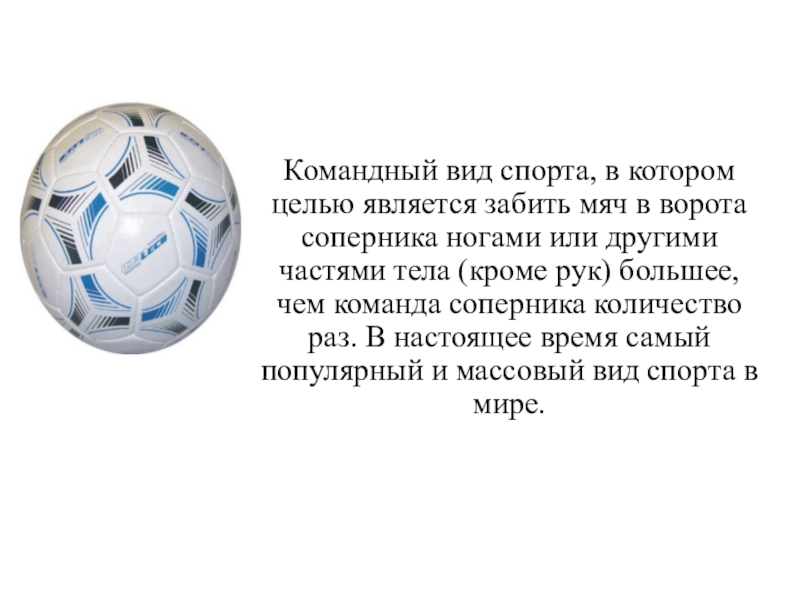 ворота соперника ногами или другими частями тела (кроме рук) большее, чем команда соперника количество раз. В настоящее время самый популярный и массовый вид спорта в мире.