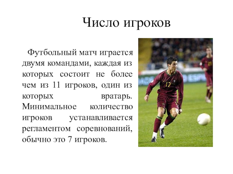 Число игроков   Футбольный матч играется двумя командами, каждая из которых