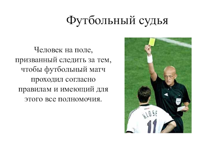 Футбольный судья  Человек на поле, призванный следить за тем, чтобы футбольный