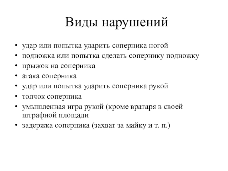 Виды нарушенийудар или попытка ударить соперника ногой подножка или попытка сделать сопернику