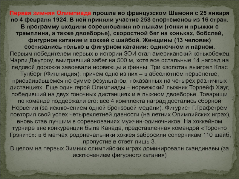 Слайд 19Первая зимняя Олимпиада прошла во французском Шамони с 25 января по