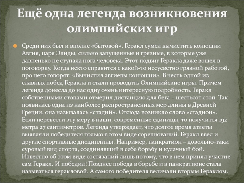 Геракл сумел вычистить конюшни Авгия, царя Элиды, сильно запущенные и грязные, в которые уже давненько не ступала нога человека. Этот подвиг Геракла даже вошел в поговорку. Когда некто справится с какой-то несусветно грязной работой, про него говорят: «Вычистил авгиевы конюшни». В честь одной из славных побед Геракла и стали проводить Олимпийские игры. Причем легенда донесла до нас одну очень интересную подробность. Геракл собственными стопами отмерил дистанцию для бега – шестьсот стоп. Так появилась одна из наиболее распространенных мер длины в Древней Греции, она называлась «стадий». Отсюда возникло слово «стадион». Если перевести эту меру в наши, современные единицы, то получится 192 метра 27 сантиметров. Легенда утверждает, что долгое время атлеты выявляли победителя только в этом виде соревнований. Геракл ввел и другие спортивные дисциплины. Например, панкратион – довольно-таки суровый вид спорта, соединявший в себе борьбу и кулачный бой. Известно об этом виде состязаний лишь потому, что в нем принял участие сам Геракл. И победил! Позднее победа в борьбе и в панкратионе стала называться геракловой. А самого победителя величали вторым Гераклом.