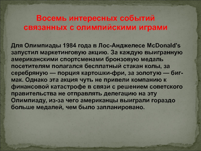 Слайд 28Для Олимпиады 1984 года в Лос-Анджелесе McDonald's запустил маркетинговую акцию. За