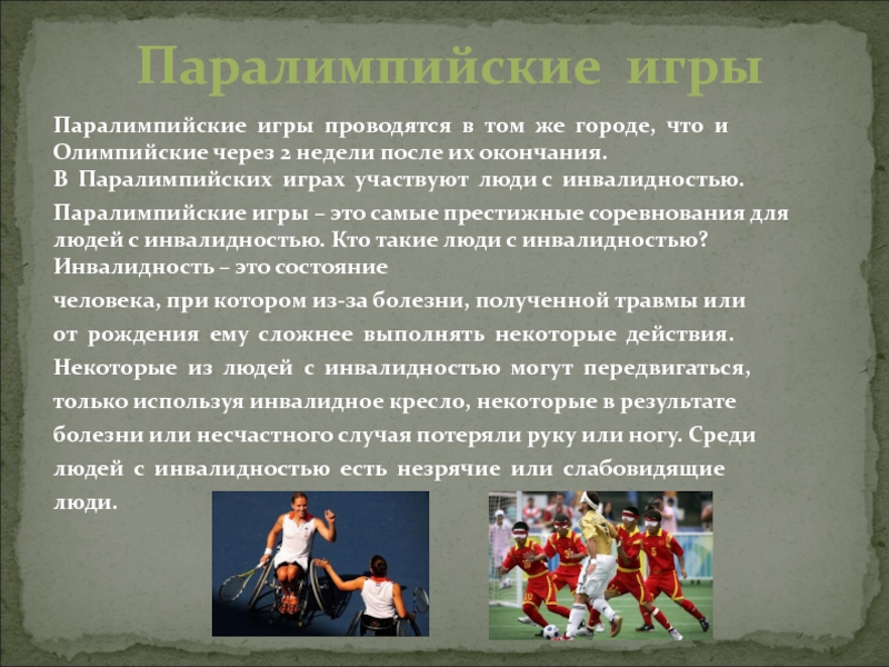 Паралимпийские игры – это самые престижные соревнования для людей с инвалидностью. Кто такие люди с инвалидностью? Инвалидность – это состояние
