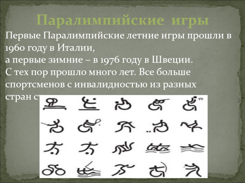 Слайд 36Первые Паралимпийские летние игры прошли в 1960 году в Италии,