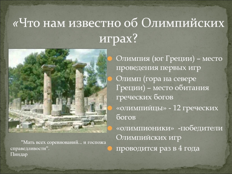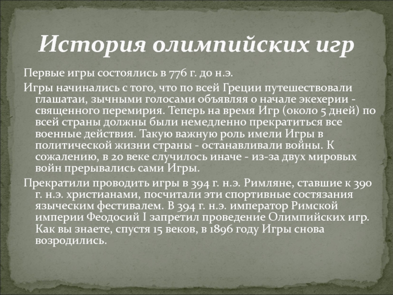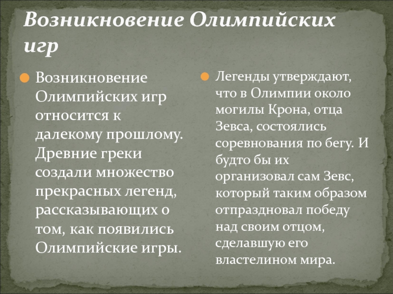 Возникновение Олимпийских игр относится к далекому прошлому. Древние греки