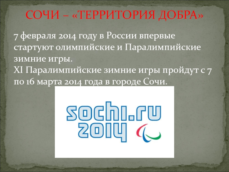 Олимпийских игр. Так, XXII Олимпийские зимние игры в Сочи пройдут с 7 по 23 февраля, а XI Паралимпийские зимние игры начнутся 7 марта
