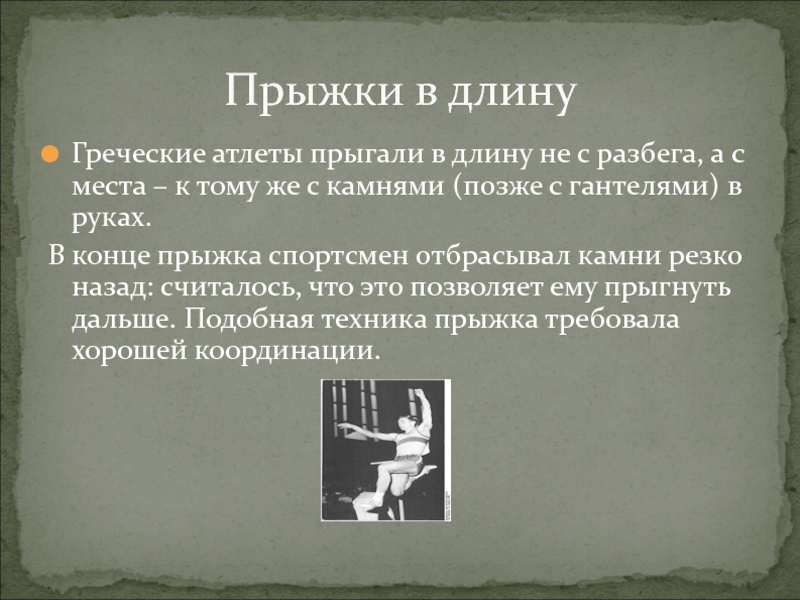 Слайд 14Греческие атлеты прыгали в длину не с разбега, а с места