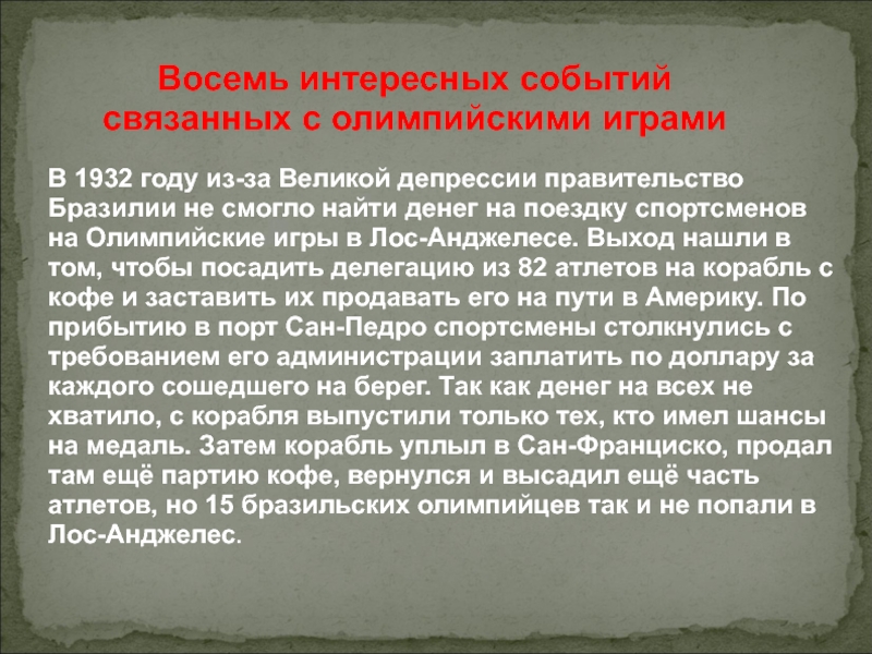 денег на поездку спортсменов на Олимпийские игры в Лос-Анджелесе. Выход нашли в том, чтобы посадить делегацию из 82 атлетов на корабль с кофе и заставить их продавать его на пути в Америку. По прибытию в порт Сан-Педро спортсмены столкнулись с требованием его администрации заплатить по доллару за каждого сошедшего на берег. Так как денег на всех не хватило, с корабля выпустили только тех, кто имел шансы на медаль. Затем корабль уплыл в Сан-Франциско, продал там ещё партию кофе, вернулся и высадил ещё часть атлетов, но 15 бразильских олимпийцев так и не попали в Лос-Анджелес.