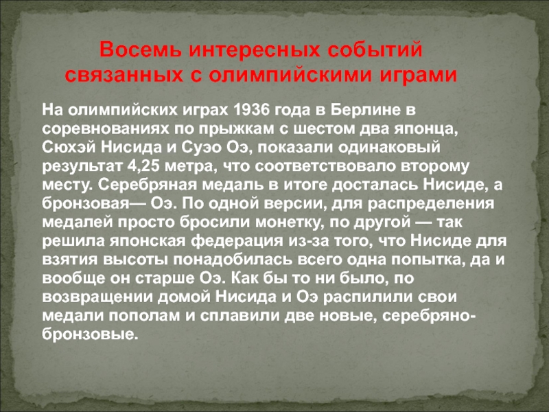 с шестом два японца, Сюхэй Нисида и Суэо Оэ, показали одинаковый результат 4,25 метра, что соответствовало второму месту. Серебряная медаль в итоге досталась Нисиде, а бронзовая— Оэ. По одной версии, для распределения медалей просто бросили монетку, по другой — так решила японская федерация из-за того, что Нисиде для взятия высоты понадобилась всего одна попытка, да и вообще он старше Оэ. Как бы то ни было, по возвращении домой Нисида и Оэ распилили свои медали пополам и сплавили две новые, серебряно-бронзовые.