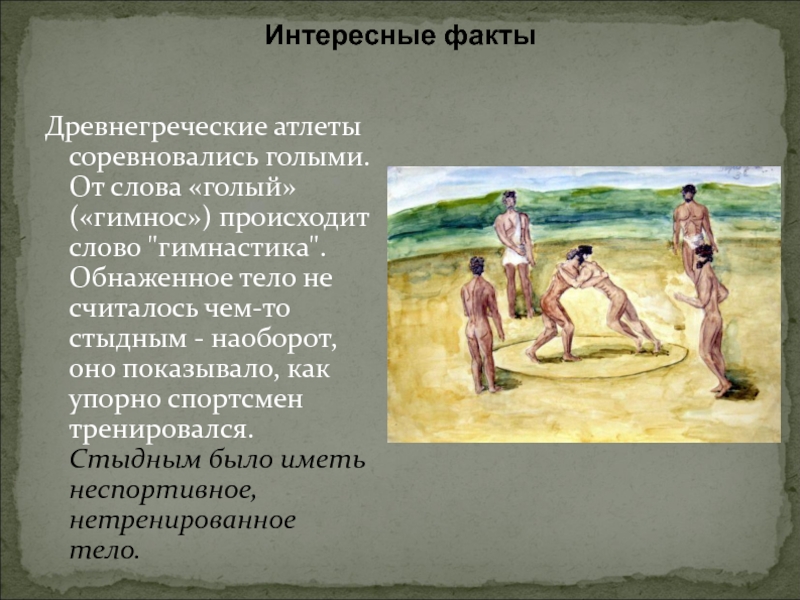 Слайд 9Древнегреческие атлеты соревновались голыми. От слова «голый» («гимнос») происходит слово "гимнастика".