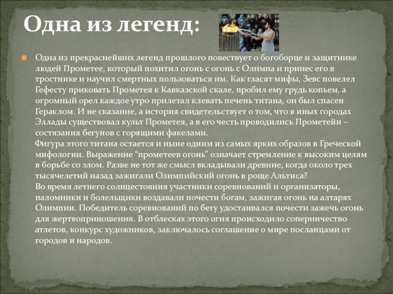 защитнике людей Прометее, который похитил огонь с огонь с Олимпа и принес его в тростнике и научил смертных пользоваться им. Как гласят мифы, Зевс повелел Гефесту приковать Прометея к Кавказской скале, пробил ему грудь копьем, а огромный орел каждое утро прилетал клевать печень титана, он был спасен Гераклом. И не сказание, а история свидетельствует о том, что в иных городах Эллады существовал культ Прометея, а в его честь проводились Прометейи – состязания бегунов с горящими факелами.