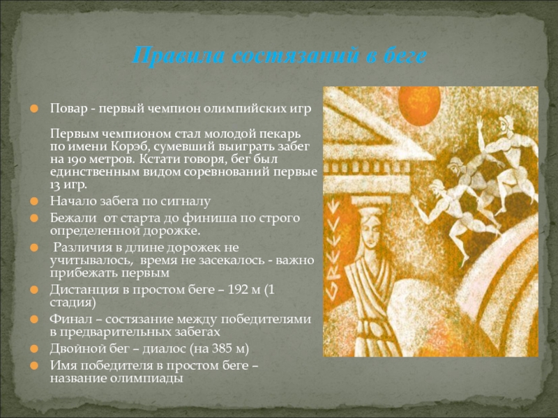 молодой пекарь по имени Корэб, сумевший выиграть забег на 190 метров. Кстати говоря, бег был единственным видом соревнований первые 13 игр.