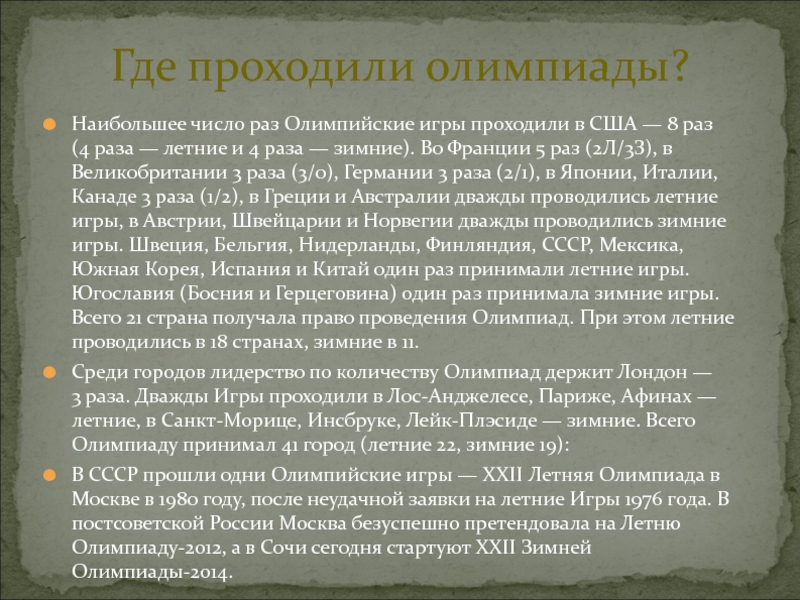 Слайд 37Наибольшее число раз Олимпийские игры проходили в США — 8 раз (4 раза — летние