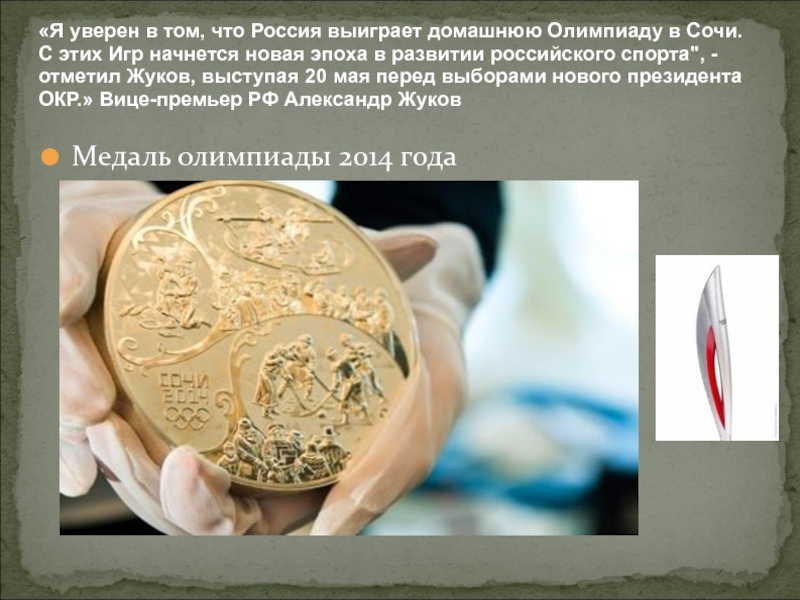 Олимпиаду в Сочи. С этих Игр начнется новая эпоха в развитии российского спорта", - отметил Жуков, выступая 20 мая перед выборами нового президента ОКР.» Вице-премьер РФ Александр Жуков