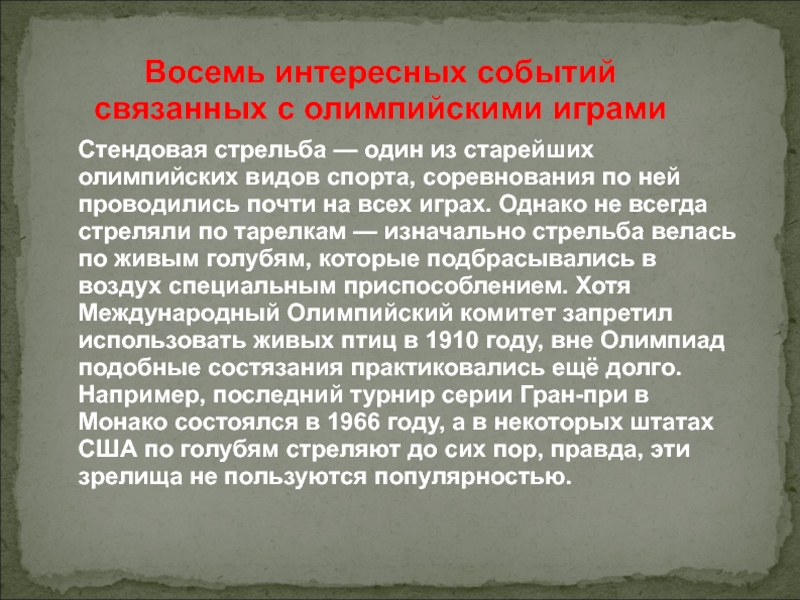 ней проводились почти на всех играх. Однако не всегда стреляли по тарелкам — изначально стрельба велась по живым голубям, которые подбрасывались в воздух специальным приспособлением. Хотя Международный Олимпийский комитет запретил использовать живых птиц в 1910 году, вне Олимпиад подобные состязания практиковались ещё долго. Например, последний турнир серии Гран-при в Монако состоялся в 1966 году, а в некоторых штатах США по голубям стреляют до сих пор, правда, эти зрелища не пользуются популярностью.