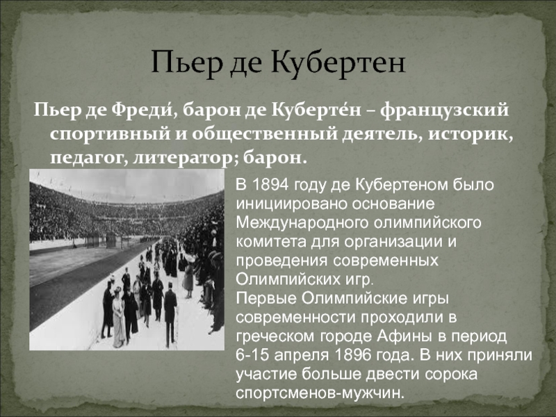 Пьер де Фреди́, барон де Куберте́н – французский спортивный
