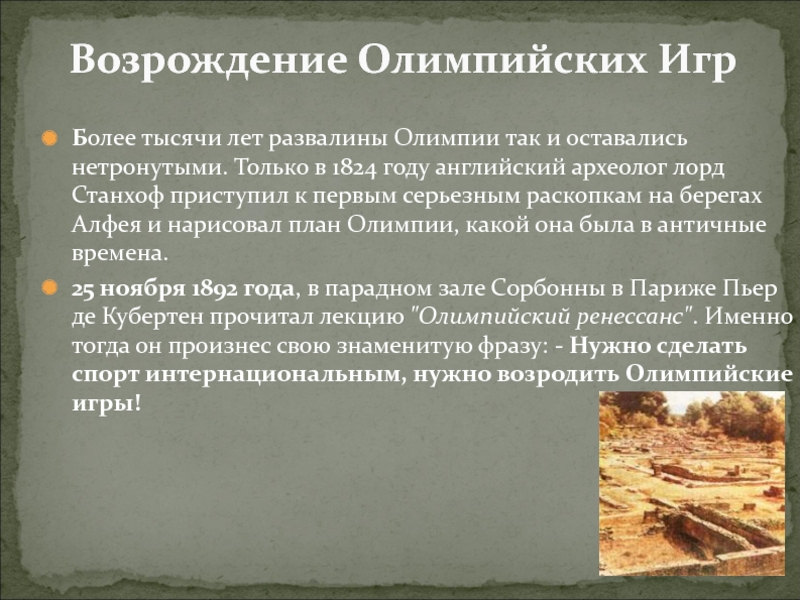 25 ноября 1892 года, в парадном зале Сорбонны в Париже Пьер де Кубертен прочитал лекцию "Олимпийский ренессанс". Именно тогда он произнес свою знаменитую фразу: - Нужно сделать спорт интернациональным, нужно возродить Олимпийские игры!