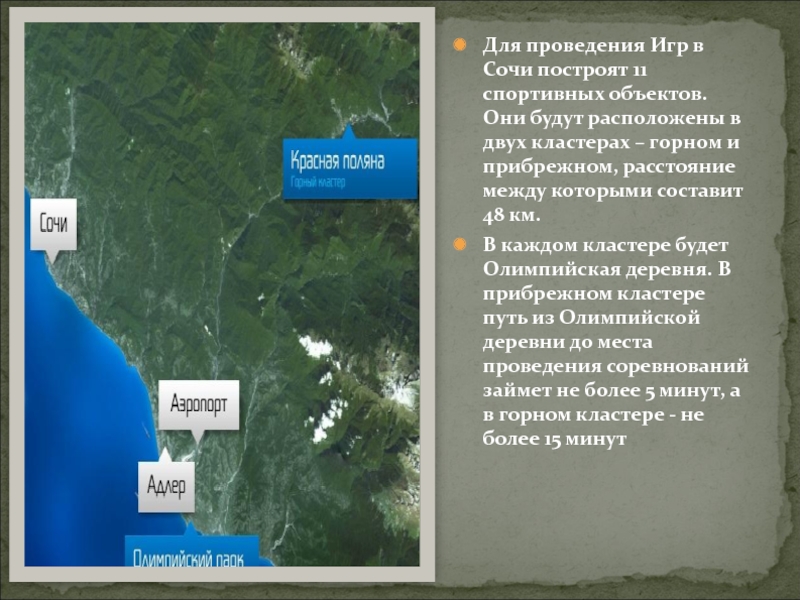 В каждом кластере будет Олимпийская деревня. В прибрежном кластере путь из Олимпийской деревни до места проведения соревнований займет не более 5 минут, а в горном кластере - не более 15 минут