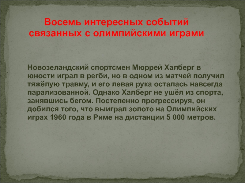 Слайд 27Новозеландский спортсмен Мюррей Халберг в юности играл в регби, но в
