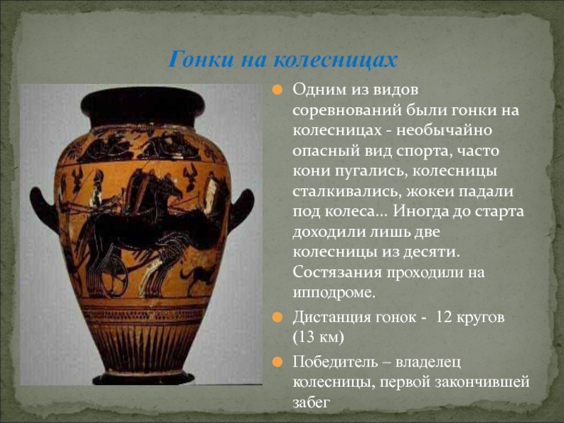 необычайно опасный вид спорта, часто кони пугались, колесницы сталкивались, жокеи падали под колеса... Иногда до старта доходили лишь две колесницы из десяти. Состязания проходили на ипподроме.