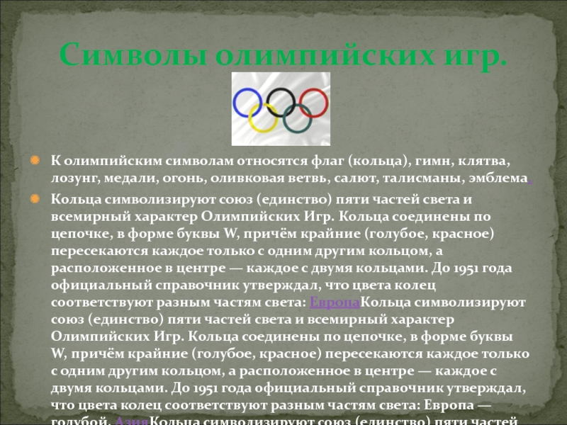 Кольца символизируют союз (единство) пяти частей света и всемирный характер Олимпийских Игр. Кольца соединены по цепочке, в форме буквы W, причём крайние (голубое, красное) пересекаются каждое только с одним другим кольцом, а расположенное в центре — каждое с двумя кольцами. До 1951 года официальный справочник утверждал, что цвета колец соответствуют разным частям света: ЕвропаКольца символизируют союз (единство) пяти частей света и всемирный характер Олимпийских Игр. Кольца соединены по цепочке, в форме буквы W, причём крайние (голубое, красное) пересекаются каждое только с одним другим кольцом, а расположенное в центре — каждое с двумя кольцами. До 1951 года официальный справочник утверждал, что цвета колец соответствуют разным частям света: Европа — голубой, АзияКольца символизируют союз (единство) пяти частей света и всемирный характер Олимпийских Игр. Кольца соединены по цепочке, в форме буквы W, причём крайние (голубое, красное) пересекаются каждое только с одним другим кольцом, а расположенное в центре — каждое с двумя кольцами. До 1951 года официальный справочник утверждал, что цвета колец соответствуют разным частям света: Европа — голубой, Азия — жёлтый, АфрикаКольца символизируют союз (единство) пяти частей света и всемирный характер Олимпийских Игр. Кольца соединены по цепочке, в форме буквы W, причём крайние (голубое, красное) пересекаются каждое только с одним другим кольцом, а расположенное в центре — каждое с двумя кольцами. До 1951 года официальный справочник утверждал, что цвета колец соответствуют разным частям света: Европа — голубой, Азия — жёлтый, Африка — чёрный, АвстралияКольца символизируют союз (единство) пяти частей света и всемирный характер Олимпийских Игр. Кольца соединены по цепочке, в форме буквы W, причём крайние (голубое, красное) пересекаются каждое только с одним другим кольцом, а расположенное в центре — каждое с двумя кольцами. До 1951 года официальный справочник утверждал, что цвета колец соответствуют разным частям света: Европа — голубой, Азия — жёлтый, Африка — чёрный, Австралия — зелёный и АмерикаКольца символизируют союз (единство) пяти частей света и всемирный характер Олимпийских Игр. Кольца соединены по цепочке, в форме буквы W, причём крайние (голубое, красное) пересекаются каждое только с одним другим кольцом, а расположенное в центре — каждое с двумя кольцами. До 1951 года официальный справочник утверждал, что цвета колец соответствуют разным частям света: Европа — голубой, Азия — жёлтый, Африка — чёрный, Австралия — зелёный и Америка — красный. Однако позже это было удалено оттуда, так как нет никаких доказательств, что Пьер де Кубертен подразумевал именно такое распределение цветов.
