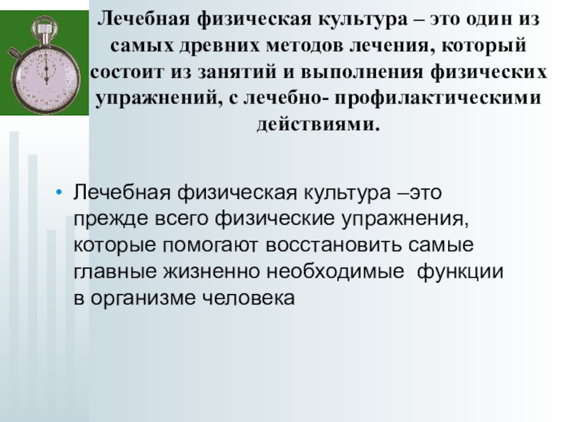 Лечебная физическая культура –это прежде всего физические упражнения, которые помогают восстановить самые главные жизненно необходимые функции в организме человека