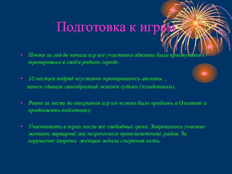 Участвовать в играх могли все свободные греки. Запрещалось участие женщин, варваров( лиц негреческого происхождения), рабов. За нарушение запрета женщин ждала смертная казнь.