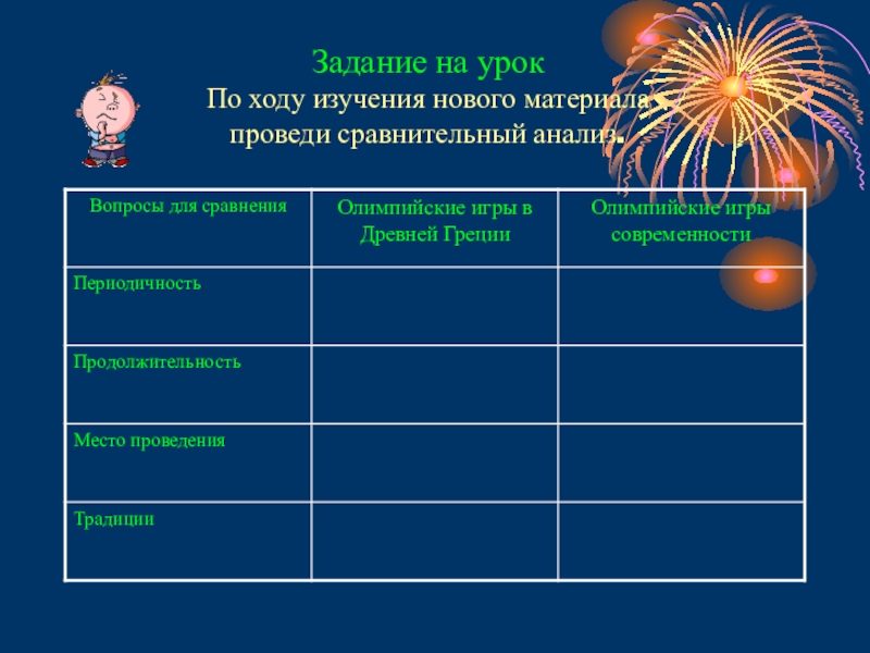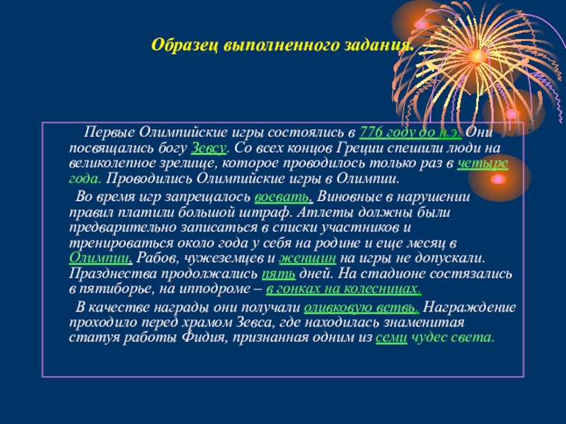 Первые Олимпийские игры состоялись в _______ году до н.э. Они посвящались богу _______ Со всех концов Греции спешили люди на великолепное зрелище, которое проводилось только раз в ________ года. Проводились Олимпийские игры в _________
