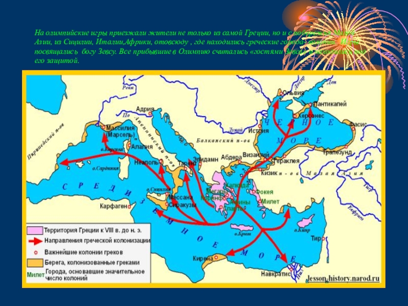и с побережья Малой Азии, из Сицилии, Италии,Африки, отовсюду , где находились греческие города- колонии. Игры посвящались богу Зевсу. Все прибывшие в Олимпию считались «гостями Зевса» и находились под его защитой.