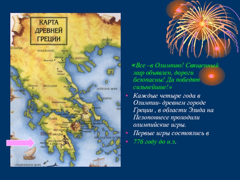 Каждые четыре года в Олимпии- древнем городе Греции , в области Элида на Пелопоннесе проходили олимпийские игры.