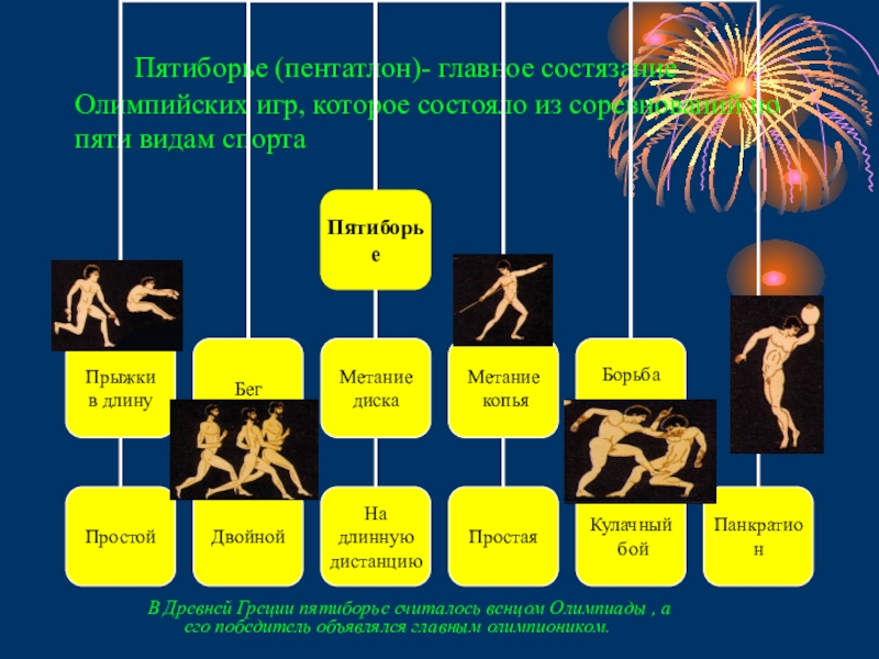 В Древней Греции пятиборье считалось венцом Олимпиады , а его победитель объявлялся главным олимпиоником.