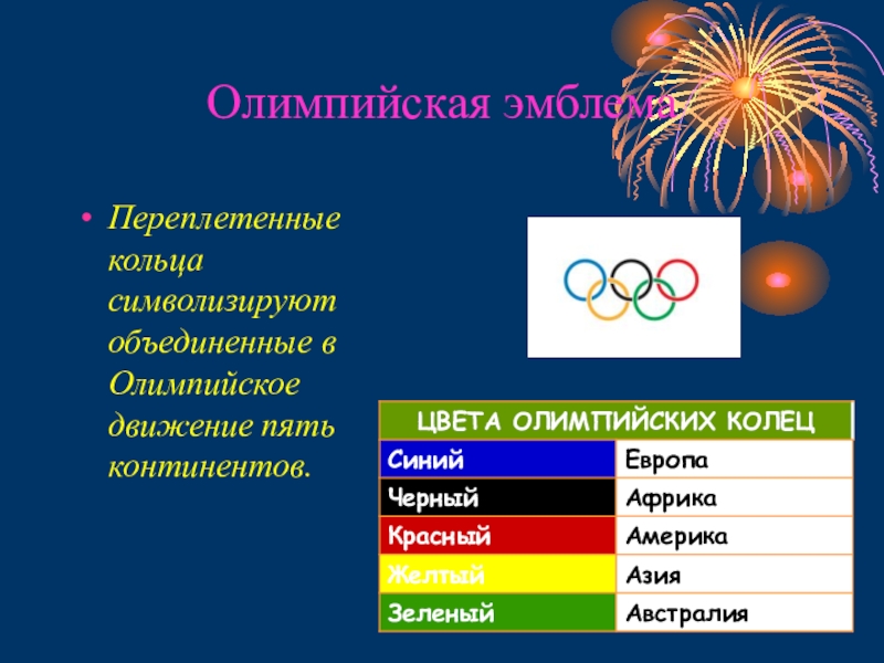 Переплетенные кольца символизируют объединенные в Олимпийское движение пять континентов.
