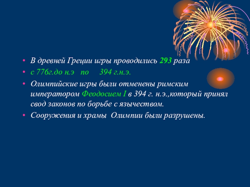 Олимпийские игры были отменены римским императором Феодосием I в 394 г. н.э.,который принял свод законов по борьбе с язычеством.