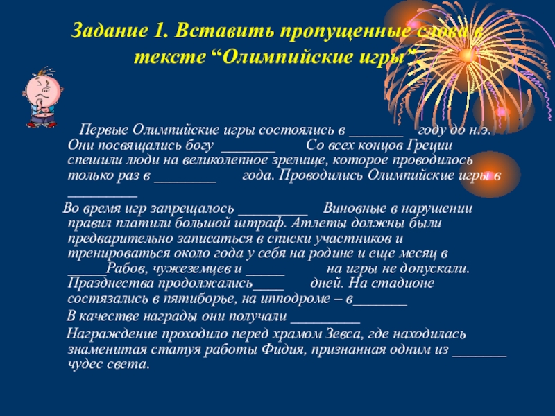 Слайд 12Задание 1. Вставить пропущенные слова в тексте “Олимпийские игры”.