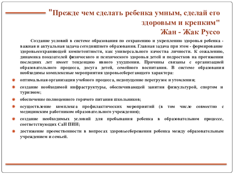 Создание условий в системе образования по сохранению и укреплению здоровья ребенка - важная и актуальная задача сегодняшнего образования. Главная задача при этом - формирование здоровьесохраняющей компетентности, как универсального качества личности. К сожалению, динамика показателей физического и психического здоровья детей и подростков на протяжении последних лет имеет тенденцию явного ухудшения. Причины связаны с организацией образовательного процесса, досуга детей, семейного воспитания. В системе образования необходимы комплексные мероприятия здоровьесберегающего характера: