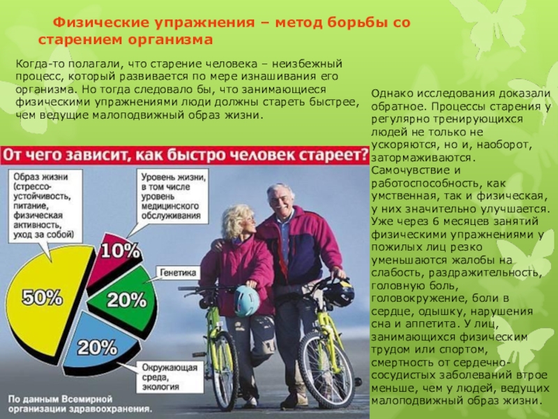Однако исследования доказали обратное. Процессы старения у регулярно тренирующихся людей не только не ускоряются, но и, наоборот, затормаживаются. Самочувствие и работоспособность, как умственная, так и физическая, у них значительно улучшается. Уже через 6 месяцев занятий физическими упражнениями у пожилых лиц резко уменьшаются жалобы на слабость, раздражительность, головную боль, головокружение, боли в сердце, одышку, нарушения сна и аппетита. У лиц, занимающихся физическим трудом или спортом, смертность от сердечно-сосудистых заболеваний втрое меньше, чем у людей, ведущих малоподвижный образ жизни.