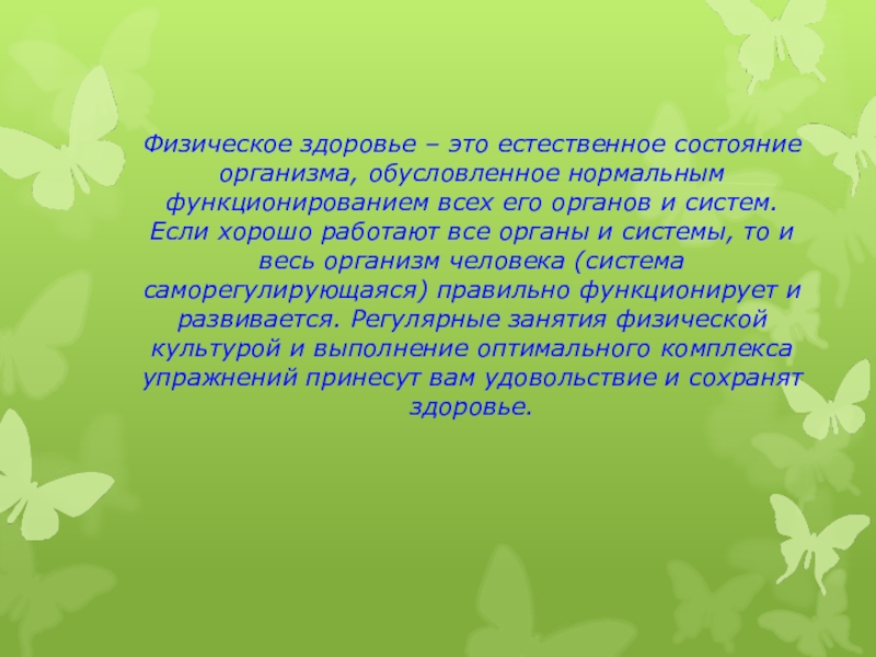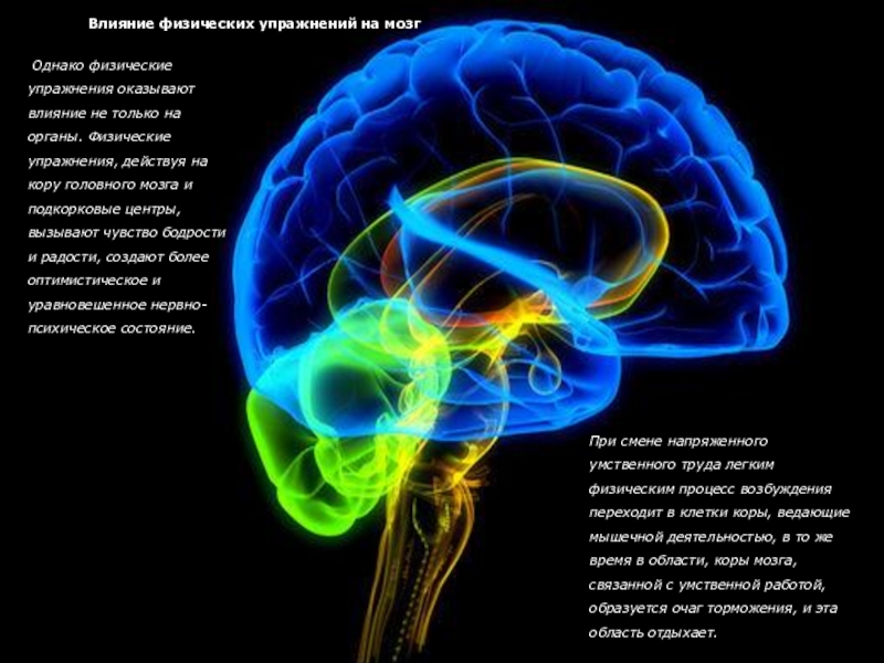 Однако физические упражнения оказывают влияние не только на органы. Физические упражнения, действуя на кору головного мозга и подкорковые центры, вызывают чувство бодрости и радости, создают более оптимистическое и уравновешенное нервно-психическое состояние.