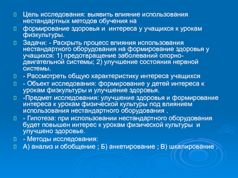 Задачи: - Раскрыть процесс влияния использования нестандартного оборудования на формирование здоровья у учащихся: 1) предотвращение заболеваний опорно-двигательной системы; 2) улучшение состояния нервной системы.