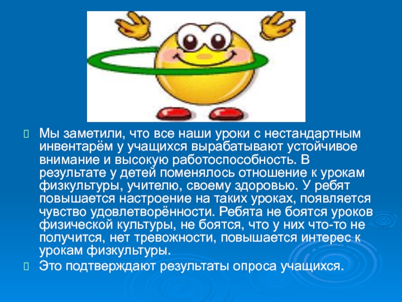вырабатывают устойчивое внимание и высокую работоспособность. В результате у детей поменялось отношение к урокам физкультуры, учителю, своему здоровью. У ребят повышается настроение на таких уроках, появляется чувство удовлетворённости. Ребята не боятся уроков физической культуры, не боятся, что у них что-то не получится, нет тревожности, повышается интерес к урокам физкультуры.