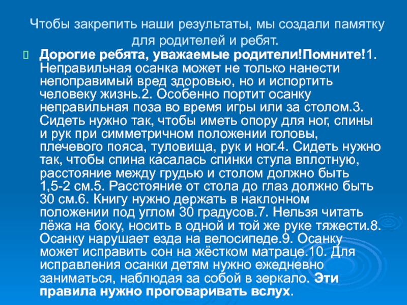 ребята, уважаемые родители!Помните!1.Неправильная осанка может не только нанести непоправимый вред здоровью, но и испортить человеку жизнь.2. Особенно портит осанку неправильная поза во время игры или за столом.3. Сидеть нужно так, чтобы иметь опору для ног, спины и рук при симметричном положении головы, плечевого пояса, туловища, рук и ног.4. Сидеть нужно так, чтобы спина касалась спинки стула вплотную, расстояние между грудью и столом должно быть 1,5-2 см.5. Расстояние от стола до глаз должно быть 30 см.6. Книгу нужно держать в наклонном положении под углом 30 градусов.7. Нельзя читать лёжа на боку, носить в одной и той же руке тяжести.8. Осанку нарушает езда на велосипеде.9. Осанку может исправить сон на жёстком матраце.10. Для исправления осанки детям нужно ежедневно заниматься, наблюдая за собой в зеркало. Эти правила нужно проговаривать вслух.