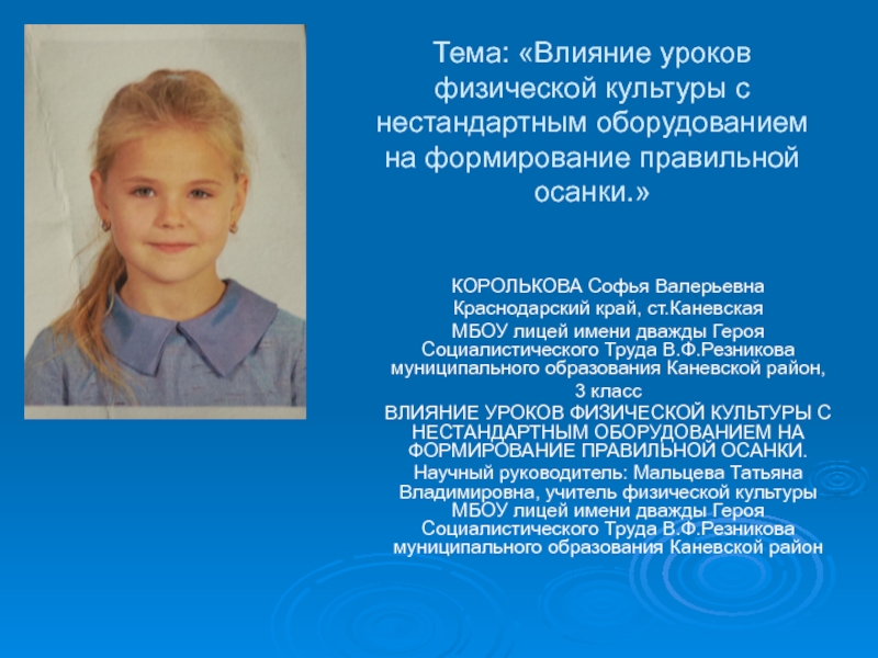 Научный руководитель: Мальцева Татьяна Владимировна, учитель физической культуры МБОУ лицей имени дважды Героя Социалистического Труда В.Ф.Резникова муниципального образования Каневской район