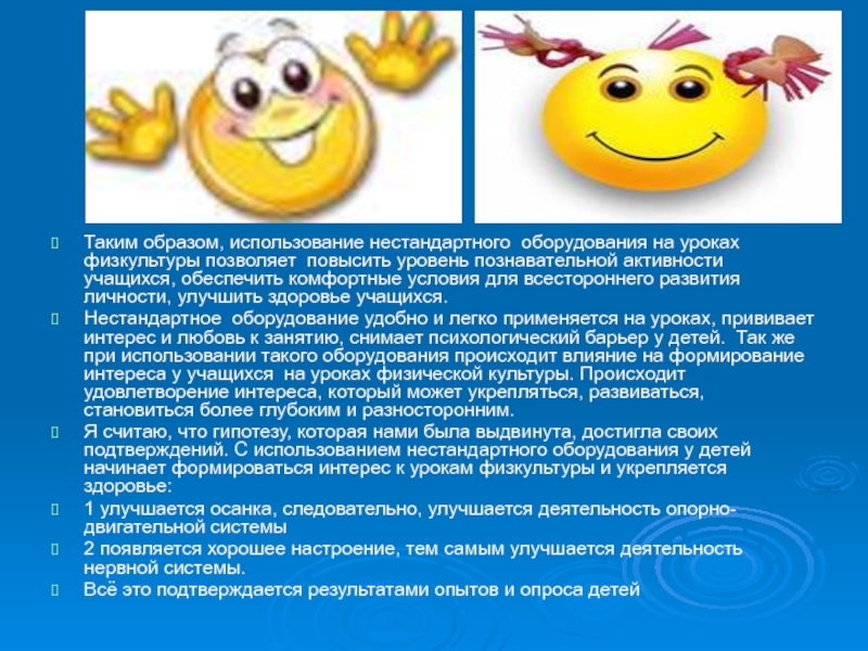 Нестандартное оборудование удобно и легко применяется на уроках, прививает интерес и любовь к занятию, снимает психологический барьер у детей. Так же при использовании такого оборудования происходит влияние на формирование интереса у учащихся на уроках физической культуры. Происходит удовлетворение интереса, который может укрепляться, развиваться, становиться более глубоким и разносторонним.